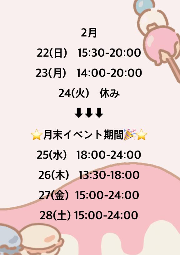 | 2月21日(土) | 19:00 ~ 03:00 |